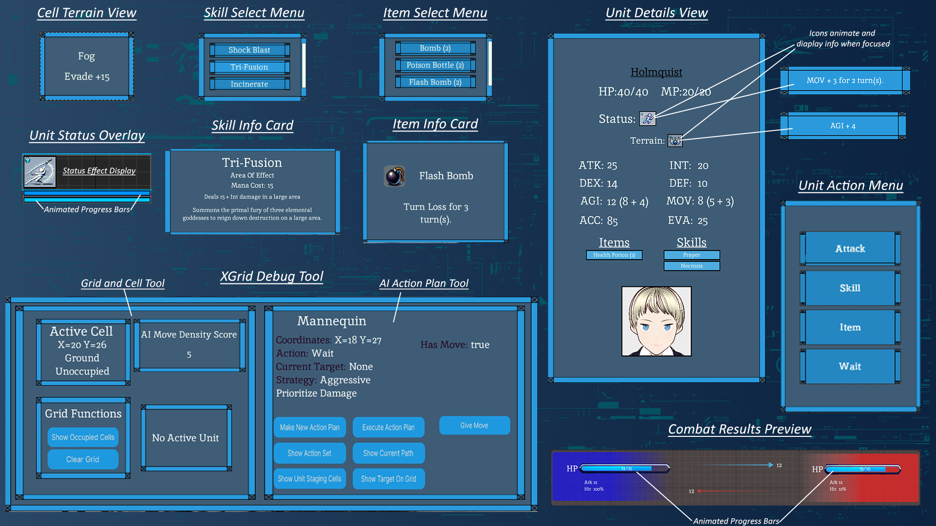 To support meaningful player choices, XGrid offers a customizable UI and player control experience. Players can navigate available actions through a responsive and reversible interface, allowing them to review and backtrack decisions before committing to actions. This supports strategic play while maintaining clarity.